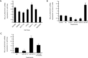This study demonstrated that linc01615 mRNA expression was upregulated in six colorectal cancer cell lines compared to the normal colon mucosal epithelial cell line. Among the six tested CRC cell lines, Caco-2 cells exhibited the highest linc01615 expression, the miR-491-5p mimic significantly decreased linc01615 expression, and miR-491-5p inhibitor significantly increased linc01615 expression, suggesting that miR-491-5p negatively regulated linc01615 expression. In contrast, silencing of linc01615 expression significantly increased miR-491-5p expression while overexpression of linc01615 significantly decreased miR-491-5p expression in Caco-2 colorectal cancer cells; this suggests that linc01615 negatively regulated miR-491-5p expression. Thus, we can conclude that linc01615 and miR-491-5p can negatively regulate each other.