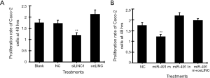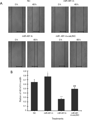 Cell scratch test showed that transfection of miR-491 m for 48 h significantly increased, whereas transfection of miR-491 In significantly decreased, the ratio of 48-h/0-h scratch width in Caco-2 cells (Figure 5A,B). Co-transfection of miR-491 m with oeLINC significantly blocked the effect of miR-491 m on cell migration (Figure 5).