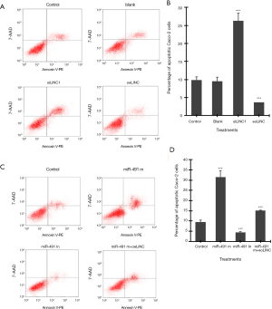 Flow cytometry assay showed that transfection of siLINC significantly increased, whereas transfection of oeLINC significantly decreased, cell apoptosis in Caco-2 cells (Figure 3A,B). Similarly, transfection of miR-491 m significantly increased, whereas transfection of miR-491 In significantly decreased, cell apoptosis in Caco-2 cells (Figure 3C,D). Co-transfection of miR-491 m with oeLINC significantly blocked the apoptotic effect of miR-491 m (Figure 3).