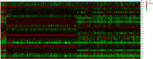 A total of 407 samples, including 375 GC tumor tissue samples and 32 adjacent nontumor tissue samples, were collected for this study. There were 1,313 differentially expressed genes in total, including 781 up-regulated and 532 down-regulated genes identified in GC and matched normal tissues. The cut-off criteria of differentially expressed genes was P<0.05 and |logFC| >2. The volcano plot of the differentially expressed genes is presented in Figure 1. The red dots represent the up-regulated genes, while the green dots represent the down-regulated genes. The heat map of the top 30 differentially expressed genes ranked according to the fold change was conducted in R with the package “pheatmap” (https://cran.Rproject.org/web/packages/pheatm/apindex.html) and is shown in Figure 2.