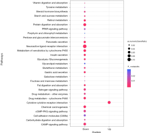 | Down | Retinol metabolism | 9.82E−05 | 9 | CYP3A4/ADH7/UGT1A7/RDH12/BCO1/ADH4/UGT2B17/UGT1A5/ADH1B |