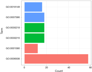 To better understand the biological functions of the dysregulated genes, GO biological enrichment and KEGG pathways analysis were performed through the “ggplot2” and “clusterProfiler” package in “R” (14). DAVID database was used to carry out functional enrichment analysis (https://david-d.ncifcrf.gov/) (15). GO analysis results included three parts, biological process (BP), cellular component (CC), and molecular function (MF). P<0.05 was considered significant.