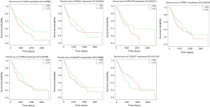 GC samples were divided into two groups according to gene expression: the high expression group and the low expression group. Kaplan-Meier survival analysis was conducted using the “survival” package in “R” to explore the associations between the expression of a specific gene and prognosis of GC patients. We analyzed the top 30 differentially expressed genes from 1,313 genes with expression differences, as well as all the genes enriched in the top 29 KEGG pathways, ranked by P value. The log-rank test was used to determine significant differences in survival curves (16), and P value <0.05 was considered as statistically significant.