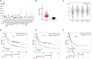 We initially explored the THY1 expression in normal tissues and GC tissues using TGCA. The results showed that THY1 has expression in most human cancers (Figure 1A) and has significant higher expression in GC tissues than that in normal ones (Figure 1B). GEPIA showed that THY1 expression is positively associated with the TNM stage of GC patients (Figure 1C). To further confirm the prognostic potential of THY1 in GC, Kaplan-Meier Plotter were used. As presented in Figure 1D,E,F, that higher THY1 expression is associated with shorter OS, FP and PPS compared to lower expression.