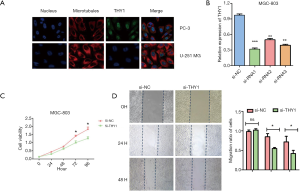 The Human Protein Atlas database showed that in PC-3 and U-251 MG cell lines, THY1 located in the nucleus and membrane (Figure 2A). To explore the physiological characteristics role of THY1 in tumor, CCK8 assay and wound healing assay was conducted in MGC-803 cell line. As shown in our results, THY1 was significantly reduced using the Si-THY1 (Figure 2B). Knockdown of THY1 could inhibit cell proliferation compared to vehicle group, indicating the inhibiting role of THY1 knockdown on GC cells aggression (Figure 2C). Moreover, the suppression of THY1 by Si-THY1 showed a lower scratch closure rate or relative migration rate compared to controlled ones seen from wound healing assay (Figure 2D). These results suggest that inhibition of THY1 could undermine the progression of GC in vitro including proliferation and metastasis.