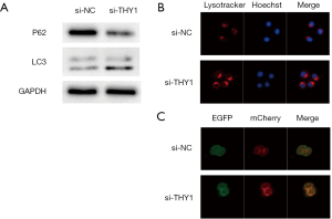 Autophagy has a dual role in GC, including a tumour-suppressor role and a tumour-promoter role. In this study, we examined the relationship between THY1 and autophagy-related protein expression in GC cells that were transfected with si-THY1. LC3 and P62 are viewed as autophagy-related markers with GC prognostic value. We found that the expression levels of LC3B increased most markedly after THY1was down-expressed for 24 h, while P62 protein expression was significantly decreased (Figure 3A). When visualized by immunofluorescence, the acidotropic dye probe, LysoTracker Red, was used to label and track cellular acidic organelles, including lysosomes and autolysosomes in living cells. As presented in Figure 3B, the red fluorescence was much brighter in cells transfected with Si-THY1for 24 h. In addition, dual-fluorescent cancer cell lines were constructed via mCherry-EGFP-LC3B transfection to detect autophagic flux in GC cells. The Red (mCherry) and green (EGFP) fluorescence indicated the formation of autophagosomes. As shown in Figure 3C, it is evident that Si-THY1transfection resulted in increased levels of fluorescence. Therefore, these data suggest that THY1 knockdown induce extensive autophagic flux in GC cell.