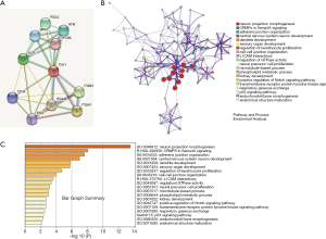 Metascape (http://metascape.org/gp/index.html#/main/step1) is a web-based portal designed to leverage more than 40 independent knowledge bases, which combines gene annotation, interactome analysis, functional enrichment and membership search. Heatmap and network of enrichment terms associated with THY1 were acquired from Metascape. STRING (https://string-db.org/cgi/input.pl) is a database of known and predicted interactions between proteins which include associations directly (physically) or indirectly (functionally). They are originated from computational predictions, transferred knowledge between organisms and interactions which generated from other databases. We used STRING to produce an interaction network between THY1 and critical proteins.