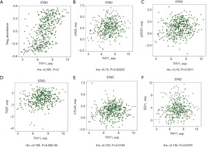 More and more researches have proved that immune system is highly related to tumor process. We investigated the relationship between THY1 expression and immune factors. Results showed that THY1 was significantly linked with Tregs (Figure 5A). Some Immunosuppressive membrane proteins whose expressions including LAG3, PDCD1, TIGIT, CTLA4, IDO1 have significant correlation with THY1expression by filtering: P<0.05 as well as |±rho| ≥0.1 were listed (Figure 5B,C,D,E,F).