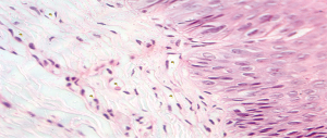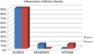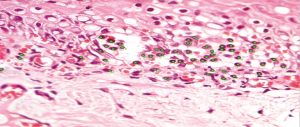 The selected samples were sectioned in 3 µm tissue sections, and slides were obtained and stained with toluidine blue and hematoxylin and eosin (HE). The inflammatory infiltrate, was quantified in HE stained sections under 100× magnification in 3 different focal fields per specimen. The inflammatory infiltrate was evaluated semiquantitatively and was considered strong (greater than 60 cells/field), moderate (30 to 60 cells/field), mild (less than 30 cells/field) or absent (5) as represented in Figure 1. The blood vessel count was performed quantitatively under 400× magnification as seen in Figure 2. For mast cell, identification and quantification the slides were stained with toluidine blue (0.1%) as represented in Figure 3. The mast cell and blood vessel count was performed with 400× magnification. A total of 10 fields per specimen were captured for mast cell and blood vessel quantification. The microscope used in the evaluation of the sample was Axio Lab A1 (Oberkochen, Germany) and the images captured with a Zeiss Axiocam 503 color camera (Oberkochen, Germany). Image analysis was performed using Image Java software (version 1.48v), with the Cell Counter plugin, on a 100% image zoom. A final consensus among examiners was made after independent evaluation.