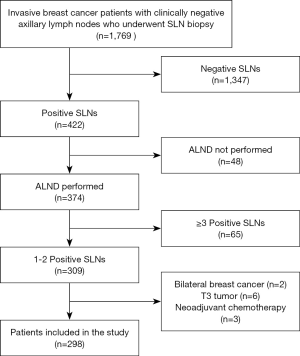 Among the 1,769 patients who underwent SLN biopsy at our hospital during the study period, 298 patients with T1–T2 tumors, clinically negative axillae, and one or two metastatic SLNs were included in the present study (Figure 1). The characteristics of these 298 patients are listed in Table 1. All patients were diagnosed with unilateral primary breast cancer and underwent surgical management (mastectomy, 217 patients; breast-conserving surgery, 81 patients). An additional axillary metastasis was postoperatively found in 113 patients (37.9%).