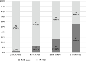 The proportions of N1 and N2/3 disease for patients with 0, 1, 2, or 3 risk factors were calculated (Figure 4). The rates of N2/3 disease in each of these patient subgroups were as follows: no risk factor, 2.47%; one risk factor, 13.01%; two risk factors, 26.32%; three risk factors, 55.56%.