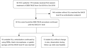 The number of tumor nodules in these 92 patients was counted. The number of LVs detected in the first DEB-TACE session and their treatment methods were also summarized. Multiple VLs found in one single tumor nodule were counted as 1 VL.