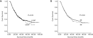 At our hospital, six randomized phase II-III clinical trials for locally advanced ESCC patients were conducted from 2002 to 2014 (Table 1). Basic characteristics of enrolled patients are presented in Table 2. The median follow-up time was 57.5 months (20.2 to 96.9 months). For all 475 patients, the overall median survival time was 30 months. The 1-, 3- and 5-year estimated overall survival rates and local control rates were 78%, 44% and 33% and 84%, 58% and 46%, respectively. Comparison of survival times between different radiotherapy techniques and fractions is shown in Figure 1. No significant difference was observed in both LACF vs. CAHF and 2DRT vs. 3DRT groups (P=0.55 and 0.64, respectively).