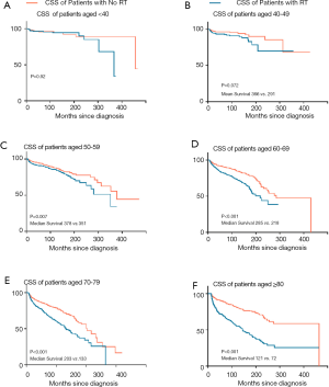 Given the significant influence of age, Kaplan-Meier method for CSS was performed by comparing radiation with non-radiation groups to evaluate the effect of radiation on cardiac death in the subgroup of age (Figure 1). RT was closely associated with declined CSS in patients over 50 years old. Five-year survival rate gap was 7.4%, 8.4%, 12.6% and 13.9% between irradiated and non-irradiated patients aged 50–59, 60–69, 70–79 and over 80 years old, respectively. Patients older than 70 years old appeared to be more easily affected by this risk factor compared with younger patients.