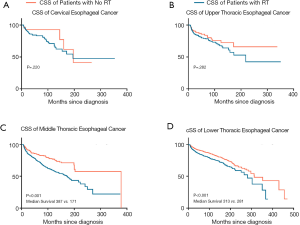 CSS was higher if the tumors in non-irradiated patients were located in the middle (HR, 1.872; 95% CI: 1.464–2.395; P<0.001) and lower thoracic segments of the esophagus (HR, 1.539; 95% CI: 1.464–1.772; P<0.001) (Figure 2). In non-irradiated patients with upper thoracic (P=0.181; 95% CI: 0.853–2.318; HR, 1.406) or cervical esophagus cancer (P=0.273; 95% CI: 0.663–4.282; HR, 1.685), the superiority of CSS was not statistically significant.