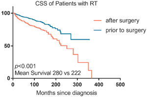 A total of 3,587 patients received both surgery and RT among which 1,935 patients’ radiation sequences were lost. The ratio of patients receiving preoperative or postoperative RT was 4:1 (1,343 vs. 309). Patients in preoperative RT group had an increased survival rate compared with those in postoperative RT group (P<0.001; 95% CI: 0.37–0.62; HR, 0.48). The 10- and 5-year survival rates of CSS were 87% and 93%, separately, in pre-operative RT group comparing 85% and 77% in post-operative RT groups (Figure S1). In subgroup analysis of subsite, the prolonged CSS of preoperative RT against postoperative RT was seen in the middle (248 vs. 150 months in average survival; P<0.001), and lower thoracic segments of the esophagus (283 vs. 239 months in average survival; P<0.001) (data were not given). CSS did not increase in upper thoracic esophagus cancer group (205 vs. 153 months in average survival; P=0.400) or cervical esophagus cancer group (152 vs. 197 months in average survival; P=0.958) (data were not given).