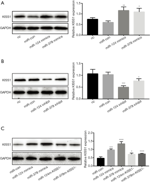 Total RNA was extracted from cells cultured from 24 hours under different treatments using TRIzol Reagent (Invitrogen, USA) according to the manufacturer’s protocol. In the presence of an RNase inhibitor (Takara Bio, Shiga, Japan), RNA samples were reverse transcribed using random hexamer primers. Real-time PCR (RT-PCR) was performed on the 7500 Real-Time PCR System (Applied Biosystems, Foster City, CA) with SYBR Premix EX Taq (Takara Bio). PCR was performed in a total volume of 20 µL. RT-PCR was performed under the following conditions: 95 °C for 20 s, followed by 40 cycles of 95 °C for 5 s and 60 °C for 30 s. Relative quantification analysis was performed by the −ΔΔCt method, and β-actin served as the endogenous mRNA reference. Relative gene expression is presented as log(2-ΔΔCt). The following primers were used: KiSS-1 (forward: 5'-AGCCGCCAGATCCCCGCA-3'; reverse: 5'-GCCGAAGGAGTTCCAGTTGTAGTT-3'), β-actin (forward: 5'-CCTCGCCTTTGCCGATCC-3'; reverse: 5'-CCTCGCCTTTGCCGATCC-3'), miR-124-3p (forward: 5'-UAAGGCACGCGGUGAAUGCC-3'; reverse: 5'-GAGCAGGGTCCGAGGT-3'), and miR-378-3p (forward: 5'-GGGACTGGACTTGGAGTCA-3'; reverse: 5'-GTGCGTGTCGTGGAGTCG-3').