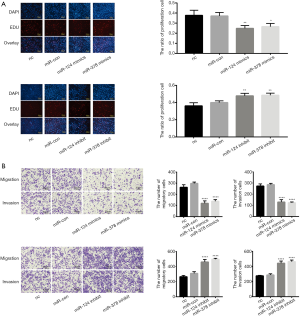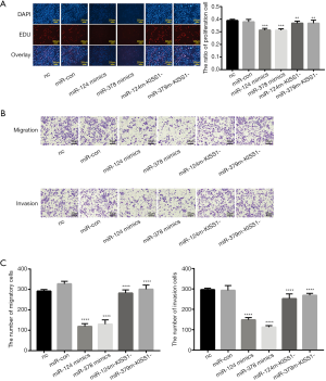 Overexpression of miR-124-3p and miR-378-3p repressed the proliferation of SW-480 cells in vitro. As shown in Figure 3A, after transfection with the mimics, the percentage of EdU-positive cells, which indicated the number of proliferating cells, decreased; in addition, the proliferation ability of SW-480 cells increased after transfection with miR-124-3p and miR-378-3p inhibitors (Figure 3A).