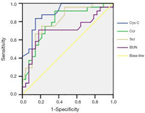 The area under the curve (AUC) of Cys C, CCr, SCr and BUN were 0.82, 0.81, 0.72 and 0.65, respectively, and Cys C and CCr had the largest values (P<0.01). After chemotherapy, the AUCROC of Cys C, CCr, SCr and BUN was 0.93, 0.91, 0.85 and 0.73, respectively, and Cys C had the largest value (P<0.01) (Figures 1 and 2).