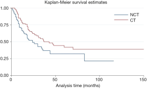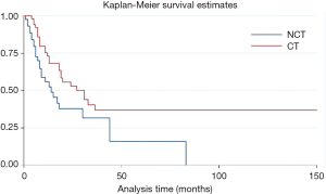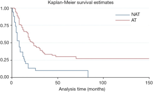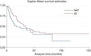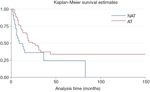 The median postoperative survival time of the entire cohort was 31 months. Patients who received adjuvant and/or neo-adjuvant therapy were associated with improved median survival [hazard ratio (HR) =0.64, P=0.017, 95% confidence interval (CI): 0.45–0.92] (Figure 2).