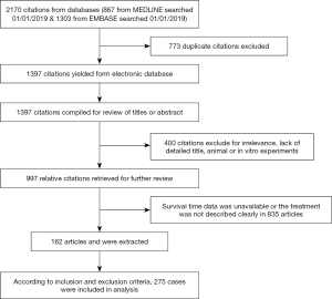 A total of 867 citations were searched from MEDLINE and 1,303 citations were searched from EMBASE. The search results were 1,397 citations after removing duplicates. After reading abstracts or titles 400 articles were excluded, because of irrelevance, no detailed title, animal or in vitro experiments. Additional 835 articles were excluded, because patients had not undergone surgery, the survival time data was unavailable or the treatment was not described clearly. In total, 162 articles were extracted. According to inclusion and exclusion criteria, 275 cases were included in analysis (Figure 1).