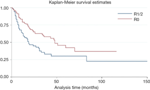 Due to resection margin status the prognosis was different. R0 resection meant longer overall survival time after surgery compared with R1/2 resection (HR =0.55, P=0.002, 95% CI: 0.37–0.79) (Figure S1). For patients with R0 resection, adjuvant and/or neo-adjuvant therapy was seem to have no effect on overall survival time after surgery (HR =0.66, P=0.14, 95% CI: 0.38–1.15). On the other hand, adjuvant and/or neo-adjuvant therapy leaded to a better overall survival time after surgery for patients who underwent a R1/R2 resection (HR =0.53, P=0.025, 95% CI: 0.31–0.92) (Figure 3).