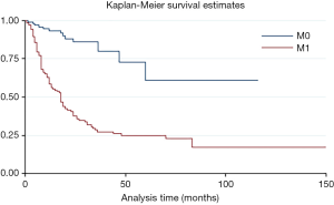 PAS is often misdiagnosed as acute pulmonary embolism (5), chronic thromboembolic pulmonary hypertension (6), mitral stenosis (7). According to the 2015 World Health Organization classification of tumors, there are several different histologic types of PAS, such as undifferentiated pleomorphic sarcoma, low-grade spindle cell sarcoma with a myxoid background, rhabdomyosarcoma, leiomyosarcoma, undifferentiated sarcoma with epithelioid or round cell features, synovial sarcoma, epithelioid hemangioendothelioma, and angiosarcoma (8). Surgical resection is the primary treatment and greatly prolongs the overall survival time (9). A few patients have long-term survival after radical resection (10-13). Depending on tumor localization, local invasion, and distal metastases, surgical methods include extensive mass resection, endarterectomy, reconstruction of the great vessels or heart (14), lobectomy (15), pneumonectomy (10), and combined lung-heart transplantation (16). The combination of different surgical methods is needed in some patients requiring complete resection or satisfied tumor cytoreduction (17). Our analysis has shown that complete resection can decrease the possibility of metastasis (Table 2). Moreover, studies have suggested that aggressive surgical resection may increase the postoperative survival time in patients with PAS (18).