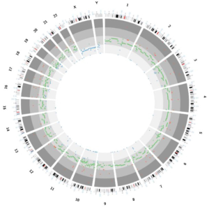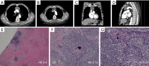 A 53-year-old male underwent a CT scan for mild dyspnea concerning pneumonia. CT imaging revealed a 4.3×2.5 cm soft tissue mass in the upper anterior mediastinum (Figure 1A). The heterogeneous attenuated tumor assumed an irregular shape, extended into the mediastinal fat and became indistinguishable from the pericardium and left brachiocephalic vein (Figure 1B,C,D). Mild non-uniform enhancement (CT value ranged 26–56 Hu) appeared on the arterial phase imaging. No regional lymphadenopathy was seen. The patient had a surgical history of varicose veins in the lower extremities 5 years ago and had no other underlying diseases. He had been a painter and had a history of contact with paint. He has been smoking cigarettes for more than 30 years, with a smoking index of 15 pack-years. His father has a history of lung cancer. The surgeon cautiously separated the adhesions and struggled to complete removal of the tumor. Under the microscope, thymoma-like epithelial cell islands scattered in a fibrotic background with interstitial hyaline degeneration, calcification, and multinuclear giant cell reaction. Glandular epithelial cells deposit in a small part (Figure 1E,F,G). The lesion boundary was unclear, invading the surrounding fat and the left brachiocephalic vein. Pathological stage was T3 according to AJCC/UICC TNM staging system, and stage III based on Masaoka-Koga classification. Though the surgical margin of the patient was negative, the tumor invaded the surrounding fat and left brachiocephalic vein. There was a risk of recurrence of the local advanced tumor. Whole-exome sequencing showed no aberrations of related signaling pathways. Copy-number variation analysis indicated deletions in chromosomes 2/3/7/8/10/12/22/22/X as well as amplifications in chromosomes 1/2/3/7/9/10/16/17/18 (Figure 2). For the locally advanced disease, radiation was delivered to the tumor bed at a dose of 95% PTV 50 Gy with conventional fractionation. CT evaluation of chest and abdomen was performed 1 month after radiotherapy, followed by revisit 3 months later. After 2 years’ regular follow-up, the patient showed no special discomfort and no recurrence or metastasis was found (Figure 3).