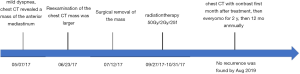 For sclerosing thymoma, complete surgical removal seems appropriate. Those who cannot achieve complete resection should consider radiotherapy, either external beam radiation, brachytherapy or intra-operative radiation. Our case is the first invasive case requiring postoperative adjuvant radiotherapy. Follow-up results show no evidence of local recurrence or distant metastasis. No proposed chemotherapy regimen or targeted therapy is available. In a case of sclerosing thymoma-like thymic amyloidoma reported in 2017 (3), a 78-year-old female with Masaoka IVa thymoma received pulse steroids for paraneoplastic nephrotic syndrome (minimal change disease). A marked reduction in tumor size was observed on maintenance therapy with prednisolone. Tumor regression can be induced by an increased steroid level. The author called for further study in the efficacy of steroid therapy for sclerosing thymoma.