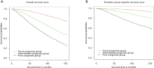 According to the OS and PCSS results in all and LT cohort, three simplified groups were divided: a good prognosis group with only one high-risk factor of T3–4 (A1), an intermediate prognosis group with one factor of PSA ≥20 ng/mL, or GS 8–10 (A2, A3, B1 and B2), and a poor prognosis group of PSA ≥20 ng/mL and GS 8–10 with/without T3–4 (B3 and C). The OS and PCSS curves of the three groups were shown in Figure 2. The 5- and 10-year OS rate of these three groups were 93.7% vs. 81.2% vs. 65.5%, and 82.1% vs. 58.2% vs. 38.2%, respectively (Table 2). With the good prognosis group as the reference, the HR and 95% CI of the intermediate and the poor prognosis group for overall morality were 2.94 (2.86–3.03) and 5.68 (5.47–5.90). As for the results of PCSS, the 5- and 10-year rate of three groups were 98.9% vs. 93.8% vs. 83.1%, and 95.8% vs. 85.1% vs. 66.5% (Table 2). Compared to the good prognosis group, the HR of the intermediate and the poor prognosis group were 4.21 (3.96–4.48) and 11.36 (10.59–12.19).