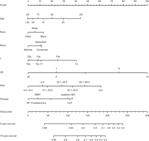 Univariate and multivariate Cox analysis showed that age, race, marital status, T stage, PSA level, GS, therapy were the independent risk factors of high-risk PCa. As for the marital status, some studies (25,26) reported it also affect the prognosis of patients. It was acknowledged that marriage likely serves as a multi-faceted proxy for many protective factors including psychosocial support, adherence to follow-up care guidelines along with choice of adjuvant and secondary therapy, healthy lifestyles as so on (27). The nomogram was constructed with risk factors in multivariate Cox analyses. This model is an intuitionistic and convenient tool for predicting survival rates. With this predicting model, the 5- and 10-year survival rates of each patient with high-risk PCa can be estimated. The C-index of our nomogram model was 0.773, indicating that the model has good accuracy. The 5- and 10-year calibration curves revealed a good agreement between the actual observation and the nomogram prediction.