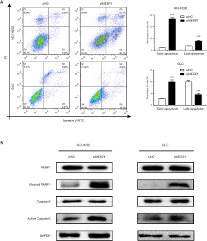 Combined with the previously biological processes analysis, the results showed that the cell cycle and apoptotic pathways were closely related to the highly expressed differential genes. So, we hoped to deeply explore the potential mechanism of apoptosis. We found that MESP1 inactivation had been shown to promote apoptosis. Annexin V-FITC/PI staining results suggested that knock-down MESP1 significantly induced apoptosis in NCI-H292 and GLC cells. The early apoptosis rate of cells in treatment group was higher than that in control group (P<0.001) (Figure 5A). Through WB experiment, we found that active Caspase3 was activated with up-regulated, and its substrate PARP1 was sheared. The expression of Cleaved PARP1 was significantly up-regulation (Figure 5B). An important substrate for Caspase3 cleavage was PARP1, a rich DNA-binding enzyme that detected signals for DNA strand breaks. Further cleavage of PARP1 showed a remarkable up-regulation of Cleaved PARP1 expression. These results suggested that the inhibition of MESP1 expression could promote apoptosis in NSCLC cells via Caspase3 /PARP1 signal pathway.