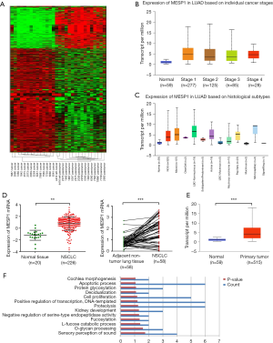 We performed human gene expression microarray studies on 15 pairs of NSCLC and ANT. The differential expression of genes was determined by the fold change (FC) and the P-value calculated by the t-test, as was shown in the heat map (Figure 1A). We selected the MESP1 gene with P<0.05, FC =6.72. Through the Ualcan website, the profiling of available cancer genome data showed that MESP1 was highly expressed across all stages of lung adenocarcinoma (Figure 1B). And the expression of MESP1 also had a significant increase compared with the normal in histological subtypes (Figure 1C), indicating the significance of this gene in disease progression and classification. Otherwise, form the Oncomine database, we further concluded that MESP1 mRNA expression was exceedingly high in lung adenocarcinoma tissues (n=226) compared to normal tissues (n=20). What’s more, in 58 paired samples, the mRNA expression level of MESP1 was significantly higher than that in ANT (Figure 1D). In the same way, we found the same result through the Ualcan website (Figure 1E).