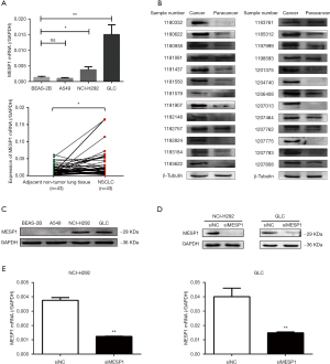 First, we examined mRNA levels of MESP1 in NSCLC, such as A549, NCI-H292, GLC and BEAS-2B cells or 4 pairs of lung squamous cell carcinoma and 39 pairs of lung adenocarcinoma (including adjacent non-tumor lung tissue and NSCLC tissue) samples by qRT-PCR. Results showed that MESP1 mRNA expression level was significantly increased in NCI-H292 and GLC cells compared to BEAS-2B. At the same time, mRNA expression of MESP1 was markedly higher in patients with NSCLC compared with adjacent nor-tumor lung tissue (Figure 2A). Next, we verified the abnormal expression of MESP1 by WB analysis at the cellular and clinical tissues, which were consistent with the above results (Figure 2B,C). And the staging levels and histological subtype classification in the patient samples were consistent with the expression changes observed in the TCGA data.
