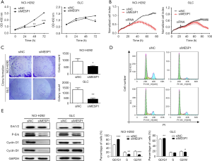 Disrupting cell cycle regulatory mechanisms can lead to cell growth uncontrolled and tumorigenesis. So, we transfected siRNA into NCI-H292 and GLC cells to suppressing the expression of endogenous MESP1. It’s observed that NCI-H292 and GLC cells displayed an effect of inhibiting cell growth activity compared to siNC group in 72 h by CCK-8 analysis (Figure 3A). Similarly, through the RTCA experiment, it’s found that the growth curve of NCI-H292 and GLC cells began to separate about 40 h. The cell index of siNC group increased continuously, while the cell activity of the siMESP1 group decreased significantly. Especially after 80 h, the treatment group has a markedly inhibitory effect (Figure 3B). In addition, the colony formation assay also indicated that the proliferation ability of NCI-H292 and GLC cells was strongly suppressed by silencing MESP1 (Figure 3C). These result showed that the down-regulation of MESP1 could dramatically repress the proliferation of NSCLC cells. Meanwhile, for flow cytometry assay, it’s depicted that the ratios of G0/G1 phase increased, but G2/M phase decreased in NCI-H292 and GLC cells (Figure 3D). Besides, the WB analysis showed that the expression of cyclin D1, cyclin B1 and p-Erk were substantially decreased (Figure 3E). So, we suspected that inhibiting the expression of MESP1 could prevent NSCLC cells from entering mitosis and DNA synthetic via Cyclin D1, Cyclin B1 and P-Erk signaling pathways.