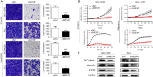In cancer metastasis, EMT pathway was closely related to the occurrence and development of tumors. Combined with transwell assays, it’s showed that after transfection of siMESP1, the migration and invasion abilities of NCI-H292 and GLC cells were sharply weakened (Figure 4A). With the increase of time, the cell index of migration and invasion was suppressed in the treatment group (Figure 4B).