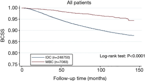The study enrolled 255,833 patients, and the baseline characteristics for IDC (n=7,084) and MBC (n=248,750) are summarized in Table 1. The differences between the MBC and IDC groups for all the variables were statistically significant (P=0.000). MBC patients were associated with a fewer negative lymph nodes (for N0: 90.27% vs. 67.48%), lower grade (for grade 1: 54.3% vs. 19.2%), earlier stage (for stage I: 65.35% vs. 50.85%), and more ER or PR positive (98.01% vs. 77.59%, 88.31% vs. 67.23%, respectively) compared with IDC. Regarding treatment type, a higher percentage of MBC patients underwent breast-conserving surgery (67.41% vs. 59.82%) and a lower percentage of MBC patients accept chemotherapy (14.98% vs. 45.64%) compared with IDC.