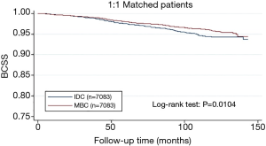 From the Figure 1, patients with MBC were associated with better BCSS than the overall IDC population. We obtained a group of 7,083 IDC patients as matched groups through 1:1 (MBC/IDC) propensity score matching method. We found no statistically significant difference in characteristics between MBC and IDC except histologic grade (Table 3). Furthermore, we found that MBC patients still presented better BCSS than the Matched IDC (Figure 2).