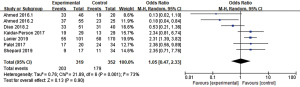 The quality of the studies (e.g., selection, comparability, and outcome) included was assessed using the Newcastle-Ottawa Scale (NOS) by two independent investigators. The total score was 9, with 1–5 being of low quality and 6–9 of high quality. Disagreements were discussed with a third author to reach a consensus.