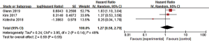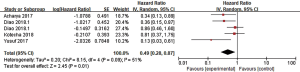 LBF was defined as the date of first tumor progression in the radiation field, and LBF was evaluated in 7 studies. Three of the studies calculated the incidence of 1-year LBF for 420 patients (26,28,30), and heterogeneity between the results was high (I2=84%). RE model analysis revealed no significant difference in 1-year LBF between the two groups (OR =1.71, 95% CI: 0.38–7.67, P=0.48) (Figure 4). Interestingly, four other studies with some heterogeneity (I2=51%) calculated the HR of LBF (17,22,38,39) and found that combination therapy may be a favorable predictor of LBF risk reduction (HR =0.49, 95% CI: 0.28–0.87, P=0.01, RE model) (Figure 5).