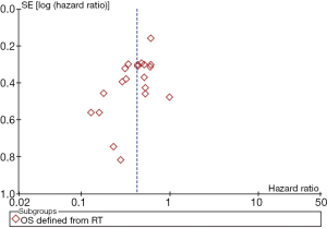 A funnel plot was constructed for OS (defined from the date of RT). The funnel plots were basically symmetrical, suggesting no significant publication bias (Figure 8). Sensitivity analysis was performed by removing each study sequentially, with consistent outcomes.