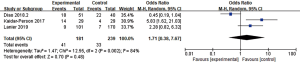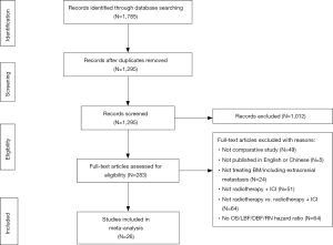 Accordingly, the synergistic antitumor effect of RT and ICI in BMs is gradually being investigated. To date, quite a few studies have demonstrated that combination treatment is effective (11), though some have shown that combination therapy only improves the tumor regression rate and has no obvious effect on OS (12). Indeed, a small number of studies report that combined treatment has no significant advantage on either OS or the local control of intracranial BMs (13-16). In this systematic review and meta-analysis (SRMA), we aimed to further evaluate the efficacy and safety of ICI and intracranial RT combination therapy. We present the following article in accordance with the PRISMA reporting checklist (available at http://dx.doi.org/10.21037/tcr-20-902).