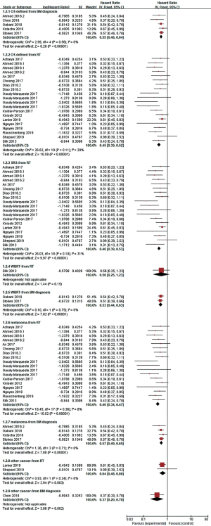| Stokes 2017 | 1 | ROCS | 2010–2013 | 1,287/185 | NR | 35.8 | Melanoma | SRS/WBRT | IPI/PD-1 | IT + RT vs. RT | From BM diagnosis | 10.8 vs. 6.1 | 0.57 (0.47–0.70) |