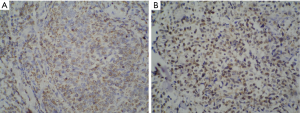 A total of 47 cases of cutaneous ENKTL diagnosed at the Pathology Department, West China Hospital (Chengdu, China) from November 2000 to July 2016 were included in the analysis. Complete clinical and immunohistochemical data were available for 27 of the cases, while only the latter were available for the remaining 20 cases. Histologic diagnosis of the tumor was based on the WHO–European Organization for Research and Treatment of Cancer classification of cutaneous lymphomas (2005) (7) and WHO classification for tumors of hematopoietic and lymphoid tissues (2008) (8). The study was conducted in accordance with the Declaration of Helsinki (as revised in 2013), and approved by the Biomedical Research Ethics Committee of West China Hospital of Sichuan University (No. 2020731). Informed consent was waived in this retrospective study.