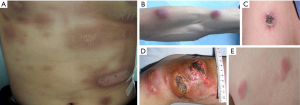 Lesions were predominantly located on the extremities (18/27, 67%), trunk (16/27, 59%), face (12/27, 44%), and genitals (5/27, 19%). In total, 24/27 patients 89% showed skin involvement at multiple locations, which presented as erythematous, nodular, swollen, or ringworm-like lesions accompanied by painless ulceration (Figure 2). Primary skin involvement was reported in 21 patients. However, in 6 cases, lesions initially occurred in the nasal region before progressing to the skin (several months to a few years later). In 4 of these patients, skin manifestations emerged within 6 months of ENKTL-N diagnosis during treatment. Two patients were diagnosed with early ENKTL-N and received nasal radiotherapy, but experienced skin recurrence after >2 years of complete remission (CR). Among patients with PC-ENKTL-NT, 78% had extracutaneous lesions detected by CT or PET/CT scan: 62% (13/21 patients) had lymphadenopathy in various parts of the body, 29% (6/21 patients) had upper aerodigestive tract lesions, and 38% (8/21 patients) showed visceral involvement. Four patients had stage I/II disease and 23 had stage III/IV disease. Fourteen patients developed systemic symptoms, with fever as the main complaint. Leukopenia was detected in 14 patients upon admission. One-third of patients (9/27) had bone marrow involvement with or without a decrease in platelet number and hemoglobin level. Of the patients who were tested, 74% (20/27) showed increased LDH level, which was ≥500 IU/L in 10 cases. β2 Microglobulin level was elevated in the majority of patients (93%; 13/14 patients) (Tables 1,2).