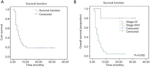 Treatment outcomes were generally poor, with only 9/20 patients showing a sustained response; these 9 patients received chemotherapy with L-asp, and 4 achieved CR. A CR was observed in 2/14 (14%) patients receiving chemotherapy only and 3/6 (50%) patients receiving chemotherapy plus radiotherapy. Figure 3A shows the survival of the 27 patients. The median duration of follow-up was 4.0 months (range, 1.0–32.0 months), and 22 patients (81.5%) died. The median survival time was 4.0 months (95% CI: 2.3–5.7 months), and mean survival time was 9.1 months (95% CI: 4.9–13.3 months). In the 5 surviving patients, survival time was >20 months; all 5 cases presented with skin lesions and received treatment that included L-asp. Figure 3B compares the OS between the 4 stage I/II patients and 23 stage III/IV patients with nasal, visceral, or bone marrow involvement. Patients with localized disease (early stage I/II) had a better outcome, with a mean survival time >26 months (95% CI: 17.68–35.92 months). Stage III/IV patients had a very poor outcome (OS: 4.7 months; 95% CI: 1.01–2.73 months). Survival rates differed significantly between the 2 groups (log-rank test, χ2=9.97; P=0.002). All 4 patients who were treated with the VDLP regimen achieved CR. Notably, a female with stage IIA disease (Patient 18) declined further therapy after 1 cycle of CEOP (cyclophosphamide, etoposide, vincristine, and prednisone) chemotherapy, citing religious beliefs. Nonetheless, her skin lesions completely disappeared 3 months after discharge. We reviewed the pathologic features of this case and confirmed that there was no misdiagnosis. It is unclear whether autoimmunity or other factors exerted an anti-tumor effect.