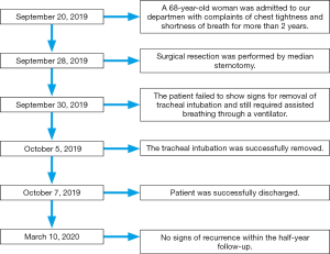 The patient failed to show signs for removal of tracheal intubation, and still required assisted breathing through a ventilator on September 30, 2019. A bedside chest X-ray showed a decrease in lung field transillumination and an increase in lung texture (Figure 3). Then anti-glucocorticoids and diuretic treatment were given for three consecutive days. The tracheal intubation was successfully removed on October 5, 2019. Postoperative recovery of the patient was good, and she was successfully discharged on October 7, 2019. Postoperative pathology showed well-differentiated liposarcoma and incomplete capsule. Immunohistochemical results are as follows: CK (−), VIM (+), Ki67 (3% +), SMA (−), CD34 (−), CD68 (−), S100 (+), CDK4 (+), MDM2 (−), P16 (+).The patient remained well and showed no sign of recurrence on March 10, 2020 (Figure 4). The timeline of the symptoms, treatment, and follow-up of this case is listed in Figure 5. All procedures performed in studies involving human participants were in accordance with the ethical standards of the institutional research committee and with the Helsinki Declaration (as revised in 2013). Written consent was obtained from the patient for publication of this case report.