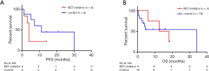 Cabozantinib was administered in nine patients, among whom one was treated with erlotinib and cabozantinib and three patients were received Anlotinib or Crizotinib. Of those who were available for the response to Cabozantinib, 2 patients (20%; 0–45) with respective KIF5B-RET and ERC1-RET fusions experienced disease progression, 2 (20%; 0–45) patients with KIF5B-RET fusions achieved stable disease (SD) and 1 (10%; 0–29) patient was not evaluable. However, no patient achieved partial or complete response (CR). Twenty-six patients with RET fusions were not administered RET inhibitors. Among these patients, 3 patients achieved partial response (11.54%; 0–24) including 2 with KIF5B-RET fusion and 1 with CCDC6-RET fusion. Stable disease was noted in 4 patients (15.38%; 2–29), 2 subjects harbored KIF5B-RET fusions, 1 had two RET fusion partners including ARHGAP12 and KIF5B and the other was positive for CCDC6-RET fusion. The PFS and OS data were available for 6 patients and 5 patients respectively in the group who received Cabozantinib. The median PFS and OS were 4 months (95% CI, 3.2–4.8) and 25 months (95% CI, 1.48–48.52). With regard to the patients who did not receive RET inhibitors, the PFS and OS data were available for 8 patients and 16 patients. The median PFS was 11 months (95% CI, 1.16–20.84) (Table 2). Survival comparison between patients who received and not received RET inhibitors indicated that there was no significant difference between the two groups in terms of PFS (Figure 4A) and OS (Figure 4B).