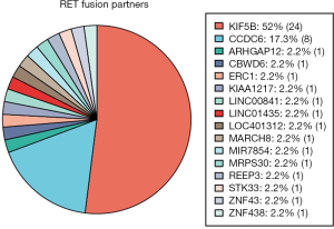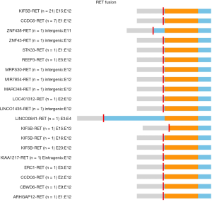 Targeted therapy has become part of the routine management of patients with positive driver gene mutations recently. Targeted drugs including tyrosine kinase inhibitors (TKI) of EGFR mutation, inhibitors of anaplastic lymphoma kinase (ALK) rearrangement, anti-angiogenesis agents, antibodies against vascular endothelial growth factor (VEGF) were approved for NSCLC treatment (7,8). The targetable fusion proteins in NSCLC were ALK, ROS1, NTRK, and RET (9). Several multi-targets RET inhibitors were demonstrated the anti-tumor effect in cell lines and xenograft with RET fusion. Clinical trials have proved the efficacy of cabozantinib (10) and vandetanib (11,12) on NSCLC patients with RET fusions. Results of a retrospective study from a global multicenter registry in NSCLC patients with RET fusions suggested that the anti-tumor activity of RET inhibitors were limited compared to targeted therapy in EGFR mutant and ALK/ROS1-rearranged patients with lung cancer (5). A retrospective study enrolled 6,125 samples summarized the clinical and molecular features of RET fusions in Chinese patients with NSCLC. However, the therapeutic efficacy of RET inhibitors in these patients remained unknown (13). Therefore, we analyzed 39 NSCLC samples with RET fusions using next-generation sequencing and collected the anonymized data. We tried to figure out the molecular features of RET fusion in Chinese patients with NSCLC. We present the following article in accordance with the MDAR checklist (available at http://dx.doi.org/10.21037/tcr-20-754).