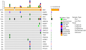 In lung tissues, KIF5B was dominantly expressed and functioned to activate the ALK/RET tyrosine kinase and downstream oncogenic effector. In NSCLC, KIF5B was the fusion partner of ALK, protein tyrosine kinase (PTK), and RET (24). KIF5B-RET fusion accounted for 2% of patients with NSCLC. Takashi Kohno et. al firstly identified KIF5B-RET fusion in patients with lung cancer from Japan and the United States using whole-transcriptome sequencing. They found an increase of RET expression in cells with KIF5B-RET fusion (25). The most common KIF5B-RET variant was K15-R12 which accounted for 87.5% of all the KIF5B-RET mutations in our study. The prevalence of K15-R12 was higher than the predicted frequency of 75% in previous reports (9,13). CCDC6 was the second common fusion partner of RET, 8 patients were positive with CCDC6-RET fusion in our study. Besides fusing to RET, CCDC6 was also the fusion partner of PDGFR, ROS1, and KITLG in NSCLC samples. CCDC6 was necessary for the activation of RET and played a critical role in sustaining the DNA damage checkpoints. The defective of CCDC6 conferred the resistance to cis-platinum and sensitized cancer cells to small molecular inhibitors of repair enzymes (26,27). Several new or rare fusion partners of RET including ZNF438, ZNF43, STK33, REEP3, MRPS30, MIR7854, MARCH8, LOC401312, LINC01435, LINC00841, KIAA1217, ERC1, CBWD6, and ARHGAP12 was also identified in our study. NGS was a more comprehensive platform to detect the new fusion partners and concurrent gene mutation comparing to reverse transcription PCR (RT-PCR) and break-apart fluorescence in situ hybridization (FISH) (28). In our study, we applied the samples using the Lung Plasma panel and capture-targeted deep sequencing to better identify the RET fusion partners and concurrent gene mutations.